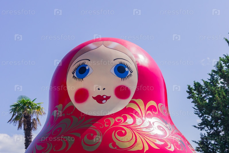 Гигантская русская матрешка на фоне голубого неба и пальм