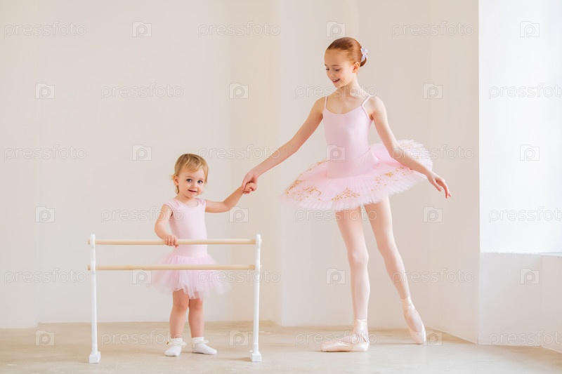 Старшая сестра, балерина в розовой пачке и пуантах, показывает малышке, как заниматься у станка