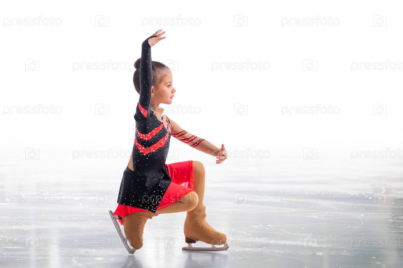 Маленький фигурист позирует в красно-черном платье на льду на белом фоне