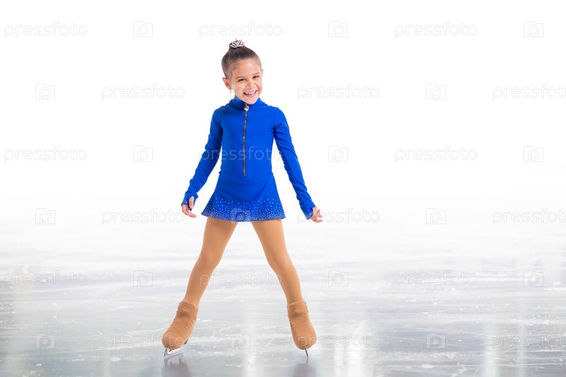 Маленький юный фигурист позирует в синем тренировочном платье на льду на белом фоне
