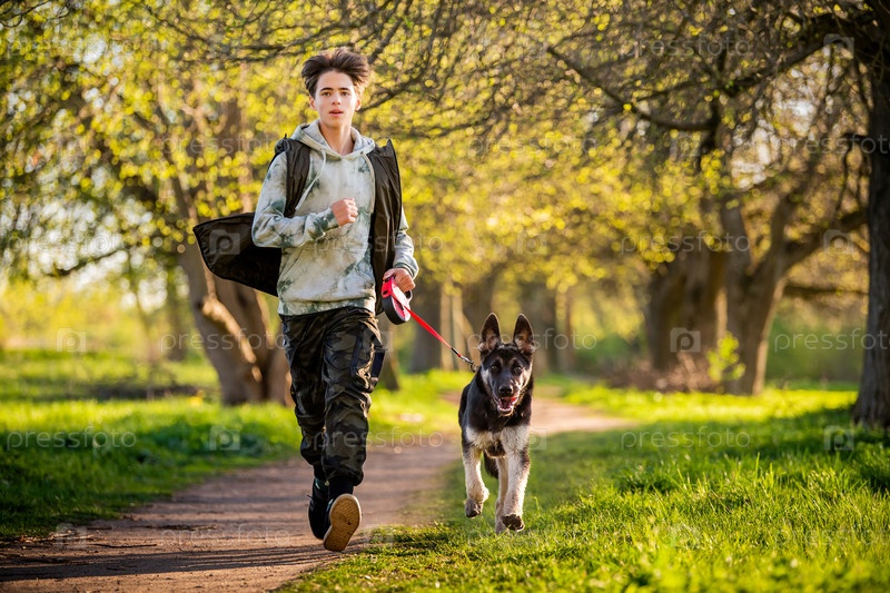 Мальчик с собакой гуляют в парке солнечным весенним вечером, бегут по дороге. Дружба человека и животного, здоровый образ жизни