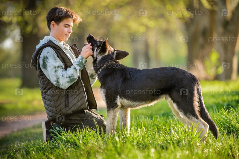 Мальчик с собакой гуляет в парке солнечным весенним вечером, сидит на траве, собака подчиняется приказу дать лапу. Дружба человека и животного, здоровый образ жизни