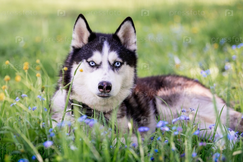 Портрет голубоглазого сибирского хаски, серьезно смотрящего в сторону среди незабудок