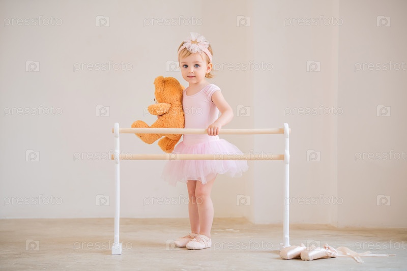 Симпатичная голубоглазая балерина в розовом, стоящая возле балетного станка с плюшевым мишкой в руках. Концепция мечты стать балериной