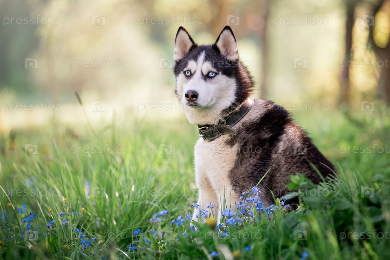 Очаровательная собака породы сибирский хаски гуляет в ошейнике на природе в парке
