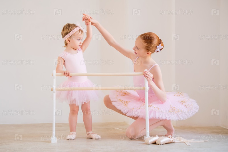 Старшая сестра, балерина в розовой пачке и пуантах, показывает малышке, как заниматься у станка