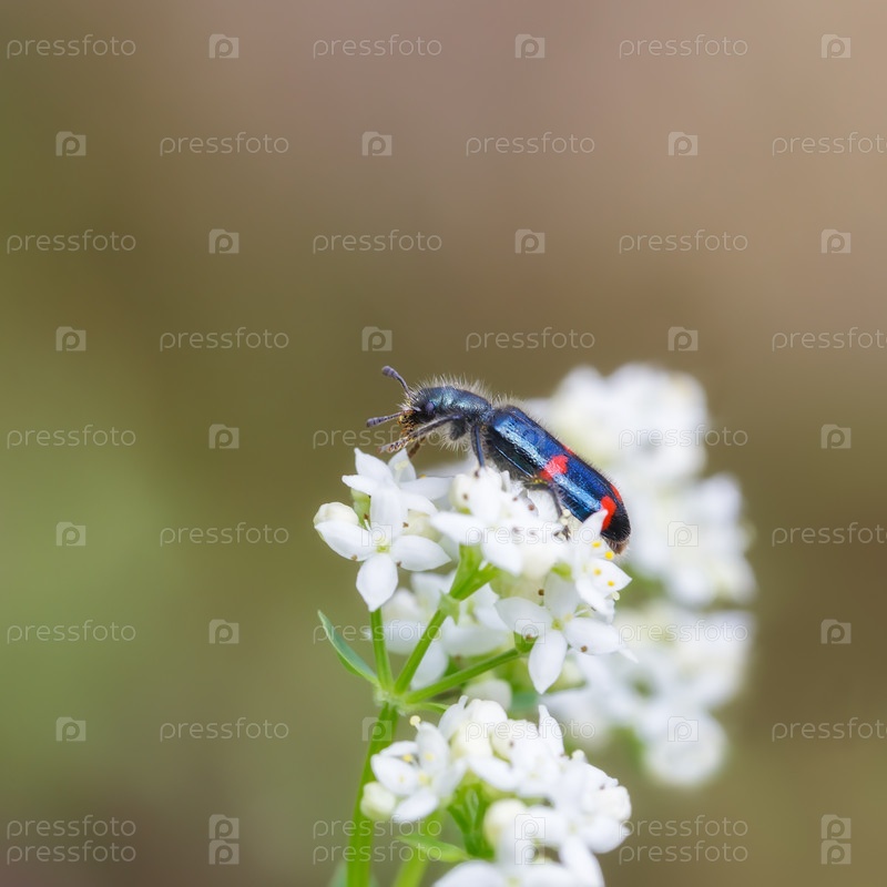 Красно-синий мохнатый жук на белых цветках, с размытым фоном, крупным планом