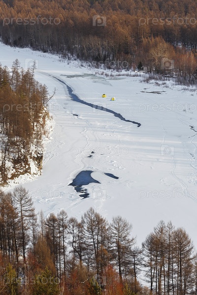 Палатки рыбаков на льду реки Чульман в Южной Якутии, Россия. Вид сверху