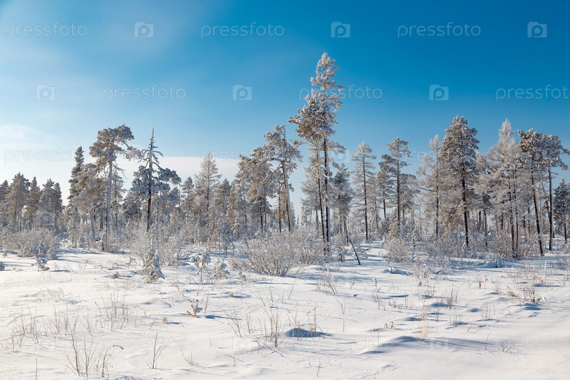 Редкий заснеженный сосновый и лиственничный лес в январе в Якутии