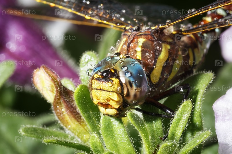 Голова стрекозы с каплями воды после дождя крупным планом