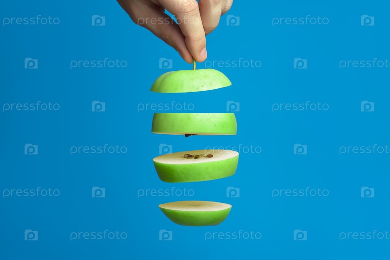 Ломтики зеленого яблока на синем фоне. Одна из частей в мужской руке
