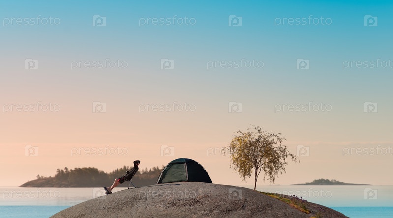 Мужчина встречает рассвет на маленьком гранитном острове. Руки за голову