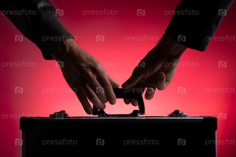 Мужчина передает металлический ящик другому мужчине. Крупный план. Красный фон