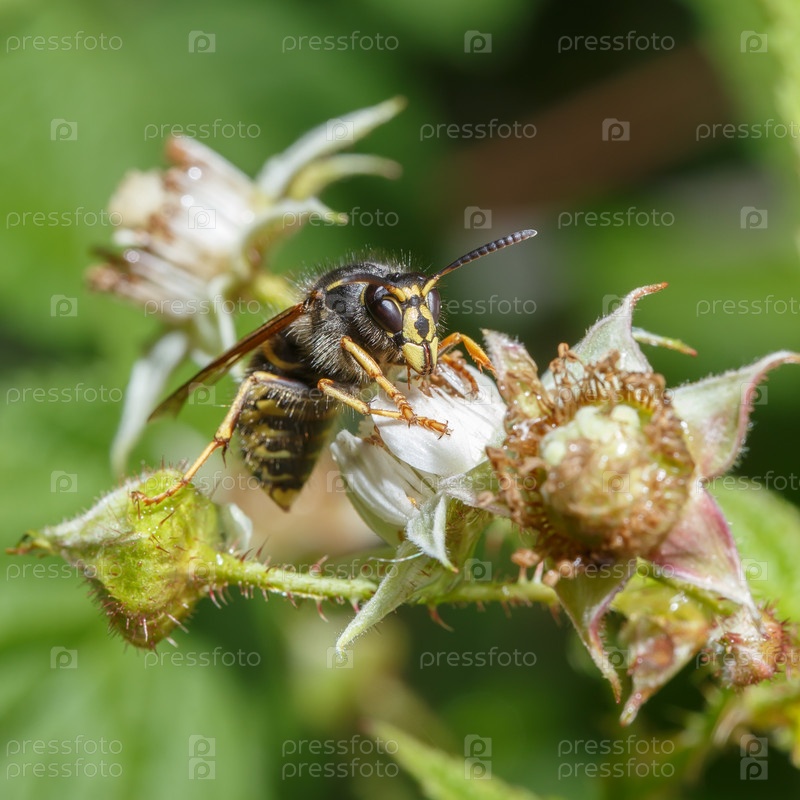 Крупный план осы на цветках малины с размытым зеленым фоном. макросъемка