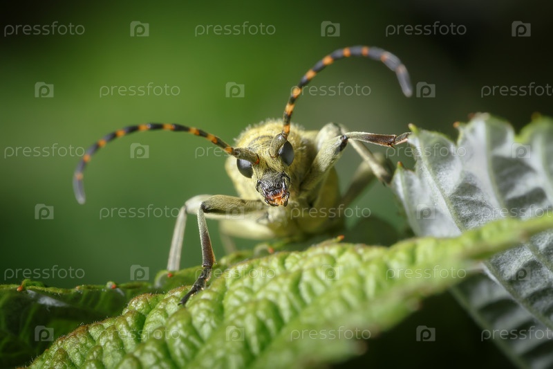 Портрет желтого жука с черными и оранжевыми антеннами, смотрящего в камеру