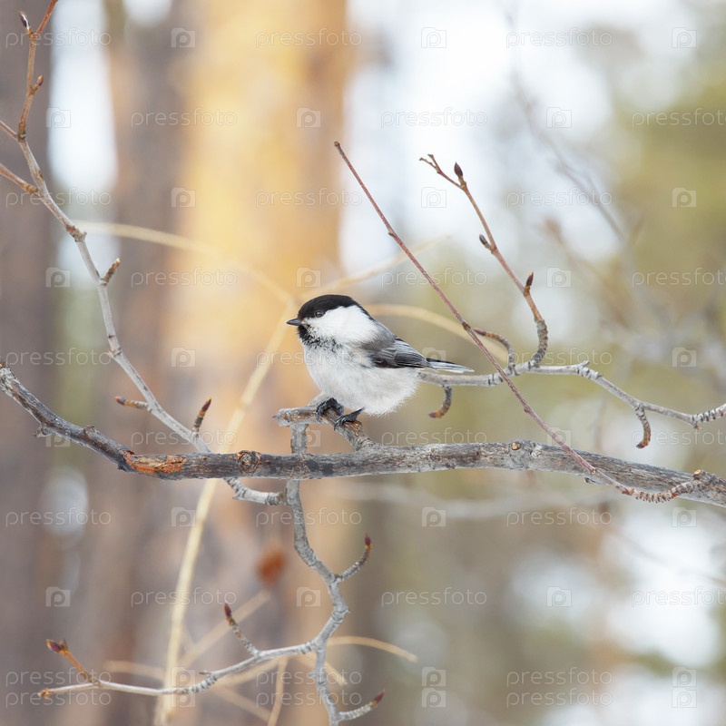 Серая синица сидит на голых ветвях ивы на размытом фоне