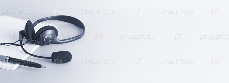 Гарнитура, блокнот в клетку и шариковая ручка на светлом фоне. Тонировка в серо-голубой цвет