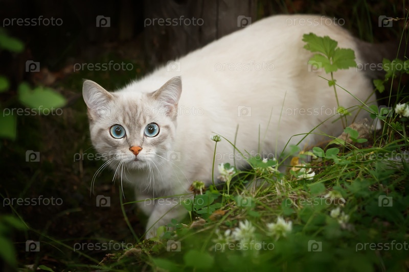 Светло-бежевый кот с голубыми глазами и оранжевым носом настороженно выглядывает из травы