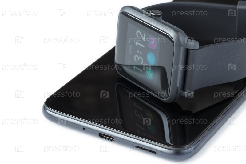 Фитнес-часы лежат на смартфоне, на белом фоне. Концепция модных гаджетов и здорового образа жизни