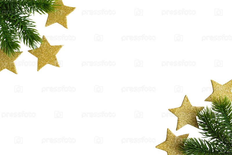Новогодняя открытка с еловыми ветками и звездами на белом фоне