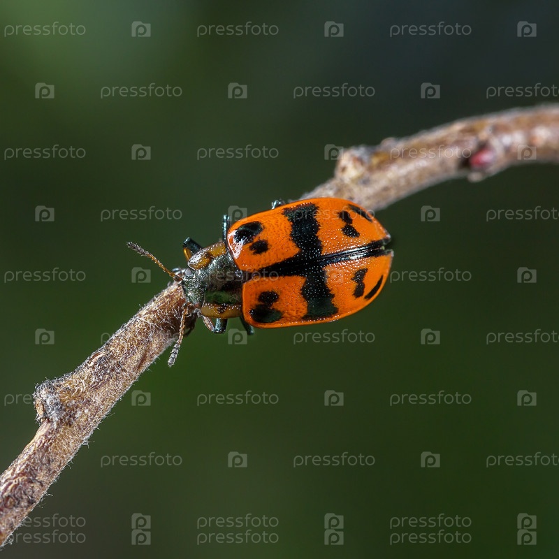 Божья коровка на ветке, крупным планом на зеленом фоне