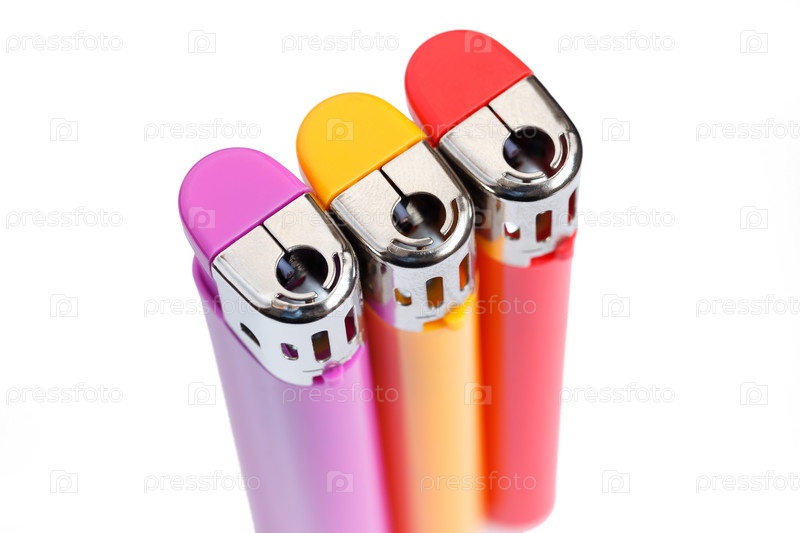 Три разноцветные газовые зажигалки на белом фоне изолированы. Вид сверху