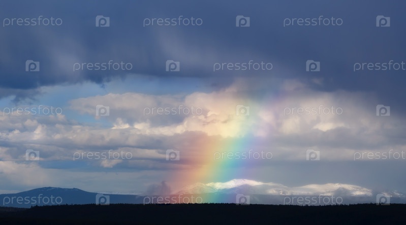 Часть радуги в ненастную погоду на фоне заснеженных гор в Южной Якутии, Россия