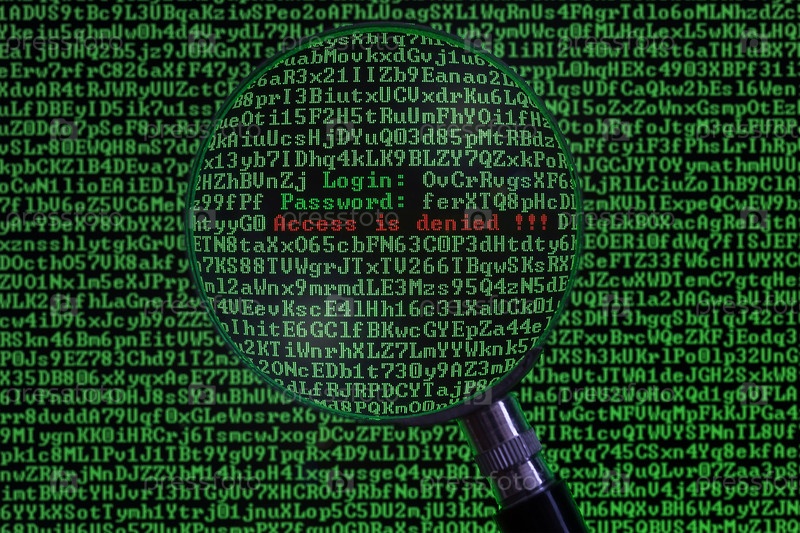 Концепция взлома компьютера в виде экрана персонального компьютера, просматриваемого через увеличительное стекло