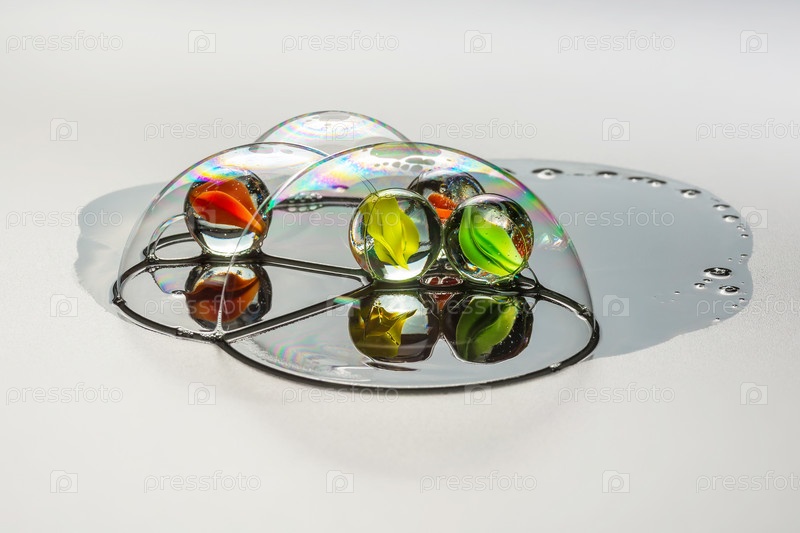Четыре разноцветных стеклянных шарика внутри мыльных пузырей