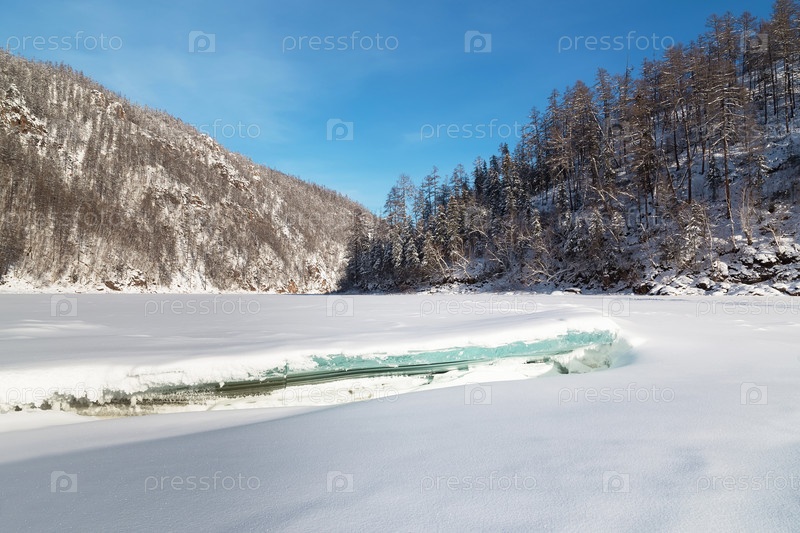 Зимний пейзаж с льдиной на переднем плане, Южная Якутия, Россия