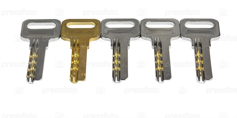 Пять ключей подряд на белом фоне изолированные крупным планом