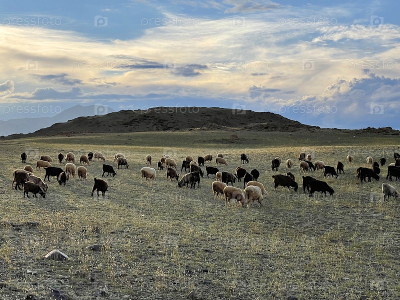 Горный козел и овцы кормятся на закате на пастбище в горах Алтая, Россия