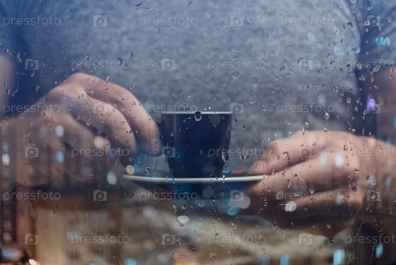 Мужчина стоит у окна и пьет кофе. Капли дождя на стекле