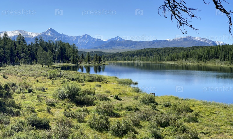 Горное озеро и высокие заснеженные вершины Алтая, Россия