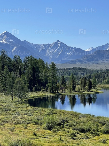 Горное озеро и высокие заснеженные вершины Алтая, Россия