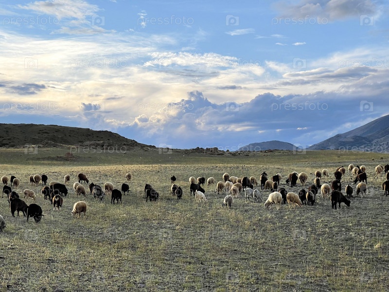 Стая горных козлов и овец, пасущихся на лужайке в горах в осенний день