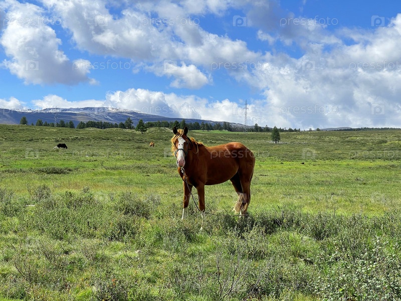 Красивая лошадь пасется на лугу. Алтай, Россия