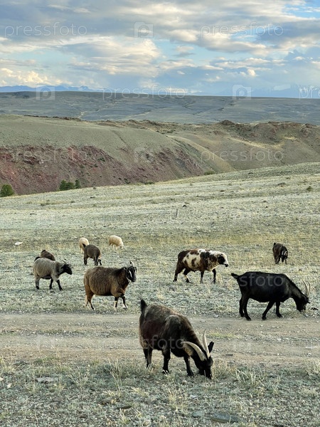 Горный козел и овцы пасутся на лужайке в горах в осенний день