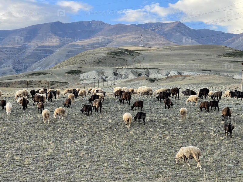 Горный козел и овцы кормятся на закате на пастбище в горах Алтая, Россия