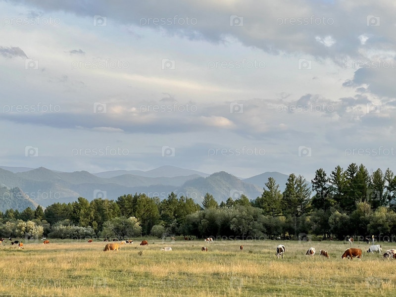 Красивое драматическое небо над горными хребтами и желтое осеннее поле с пасущимися коровами, Алтай, Россия