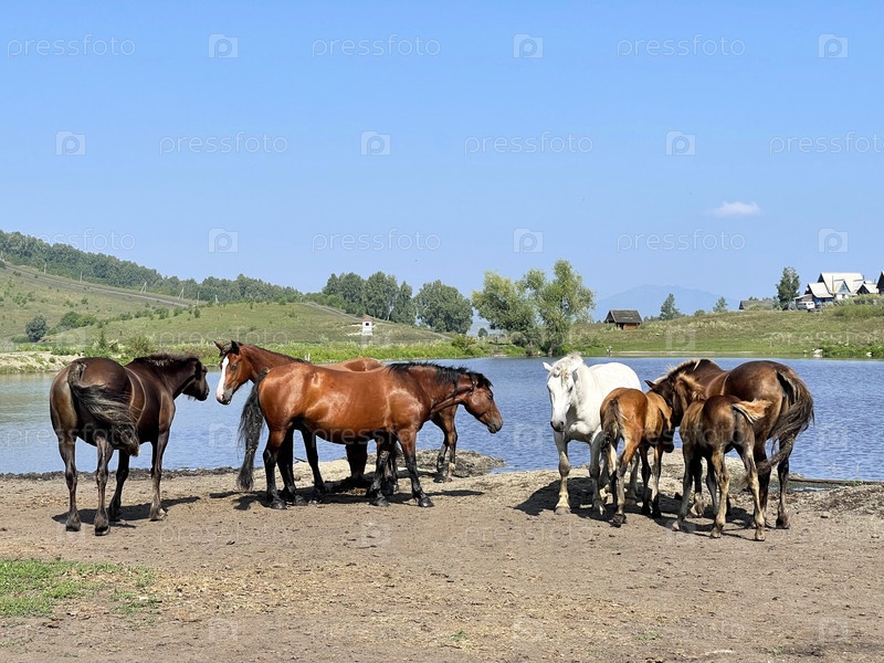 Стадо лошадей стоит у озера