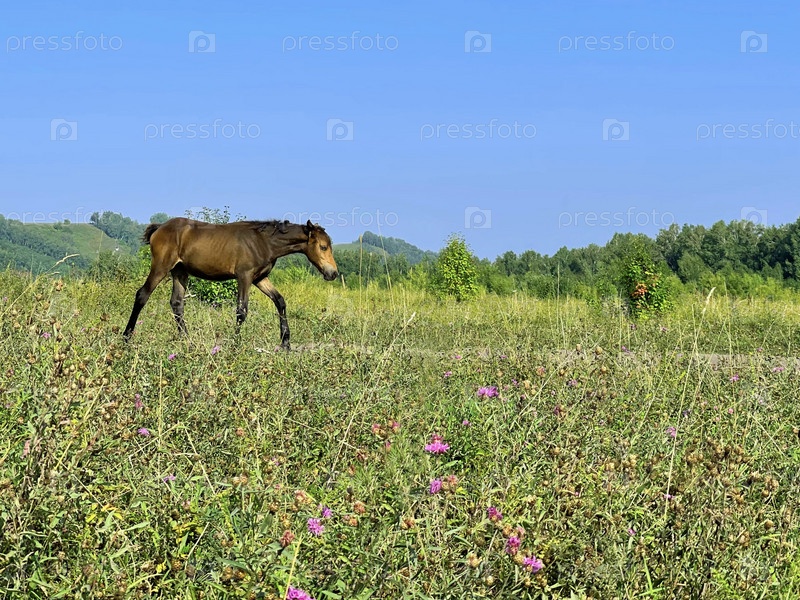 Одинокий дикий жеребенок гуляет по полю с зеленой травой