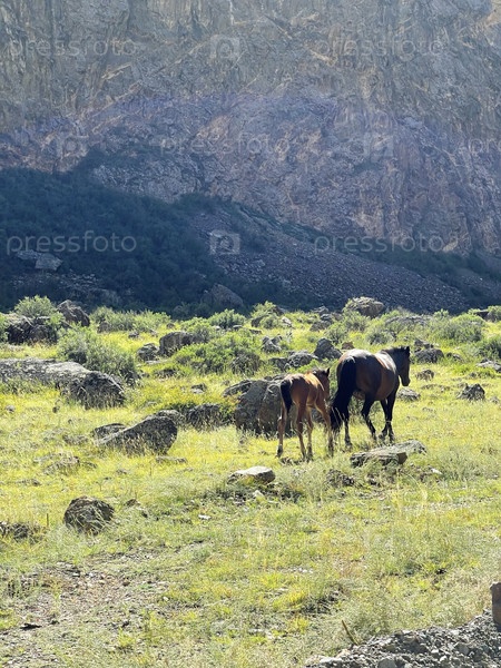 Дикие лошади: жеребенок и его мать уходят в горы. Алтай, Россия