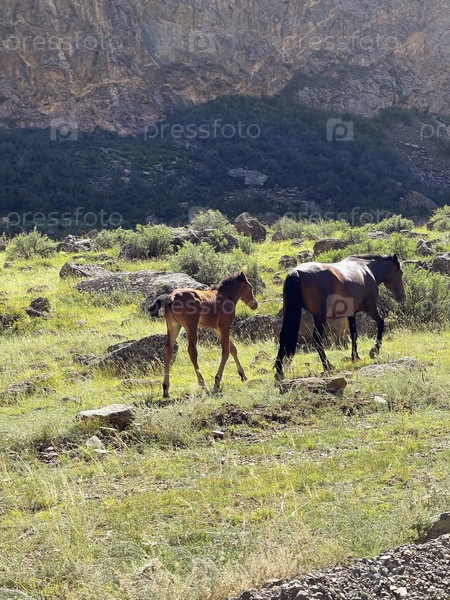 Дикие лошади: жеребенок и его мать уходят в горы. Алтай, Россия