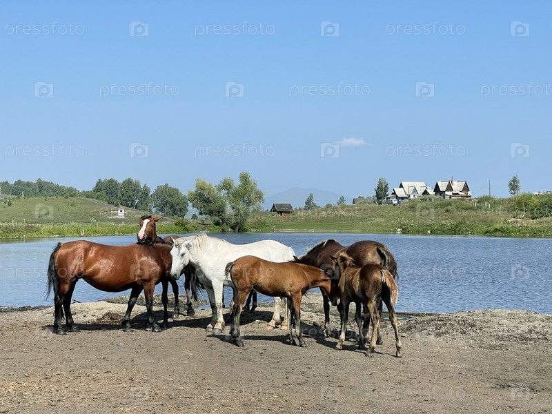 Стадо лошадей стоит у озера
