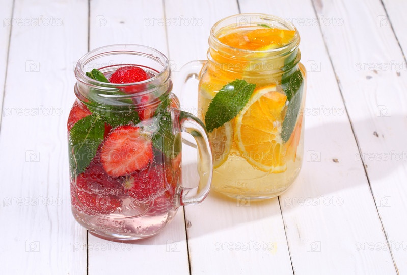 Ягодно-фруктовые коктейли на белом деревянном столе