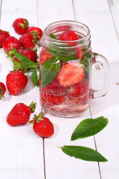 Клубничный коктейль на белом деревянном столе