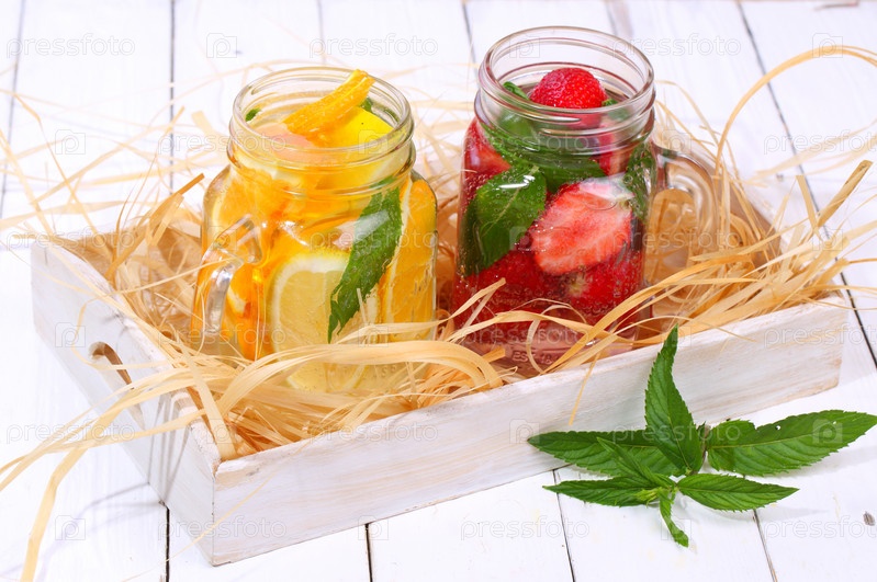 Ягодно-фруктовые коктейли на белом деревянном столе