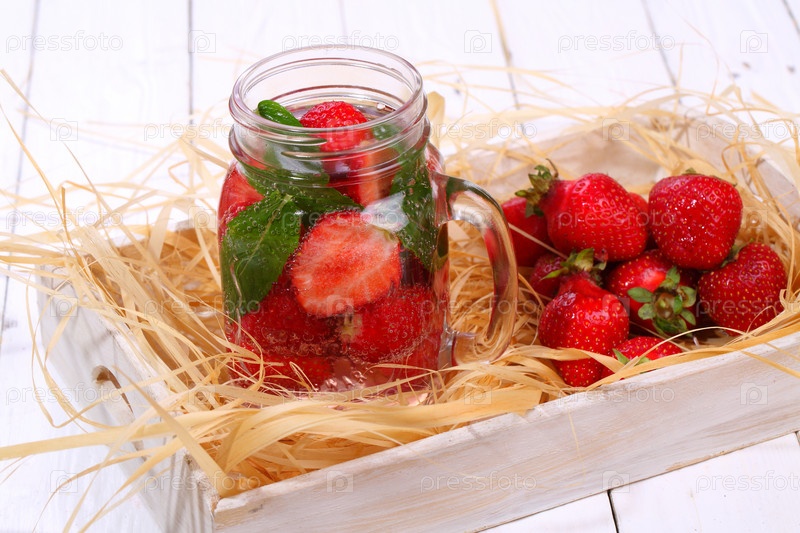 Клубничный коктейль на белом деревянном столе