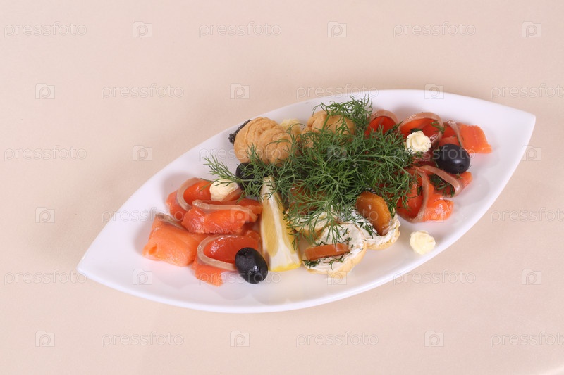 Кусочки красной рыбы на тарелке с маслинами, лимоном, укропом и белым соусом